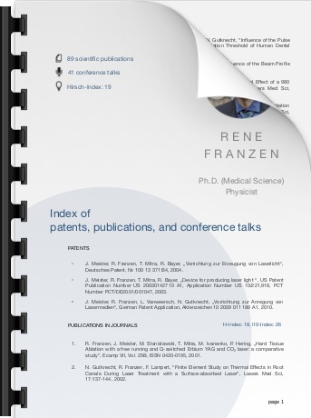- R. Franzen, „Finite Element Study on thermal effects in root during laser treatment with a surface absorbed laser”, Vortrag auf der 11. Jahrestagung der Deutschen Gesellschaft für Laserzahnheilkunde e.V., Berlin, 2002. (11th Conference of the German Society for Laser Dentistry)