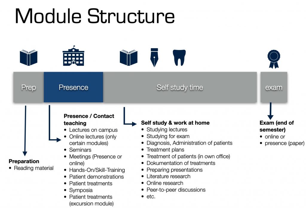 In addition, there will be an excursion week to Misr International University (MIU) in Cairo (Egypt). The parts of the study that are not done during the contact time are represented in self-study phases and patient treatment, preparation of modules, as well as in-depth online seminars and lectures. In addition, a master thesis is written in the last 2 semesters.